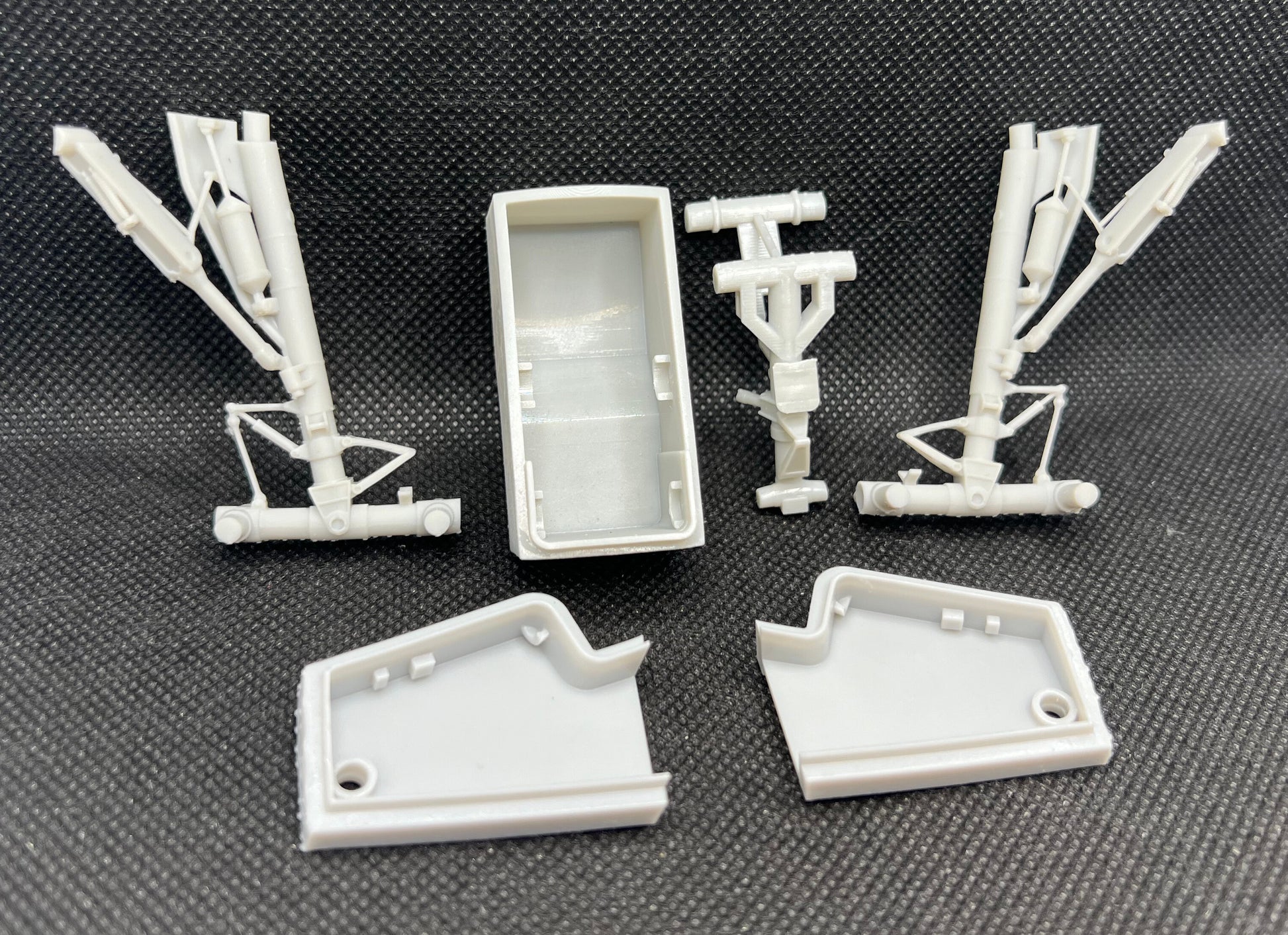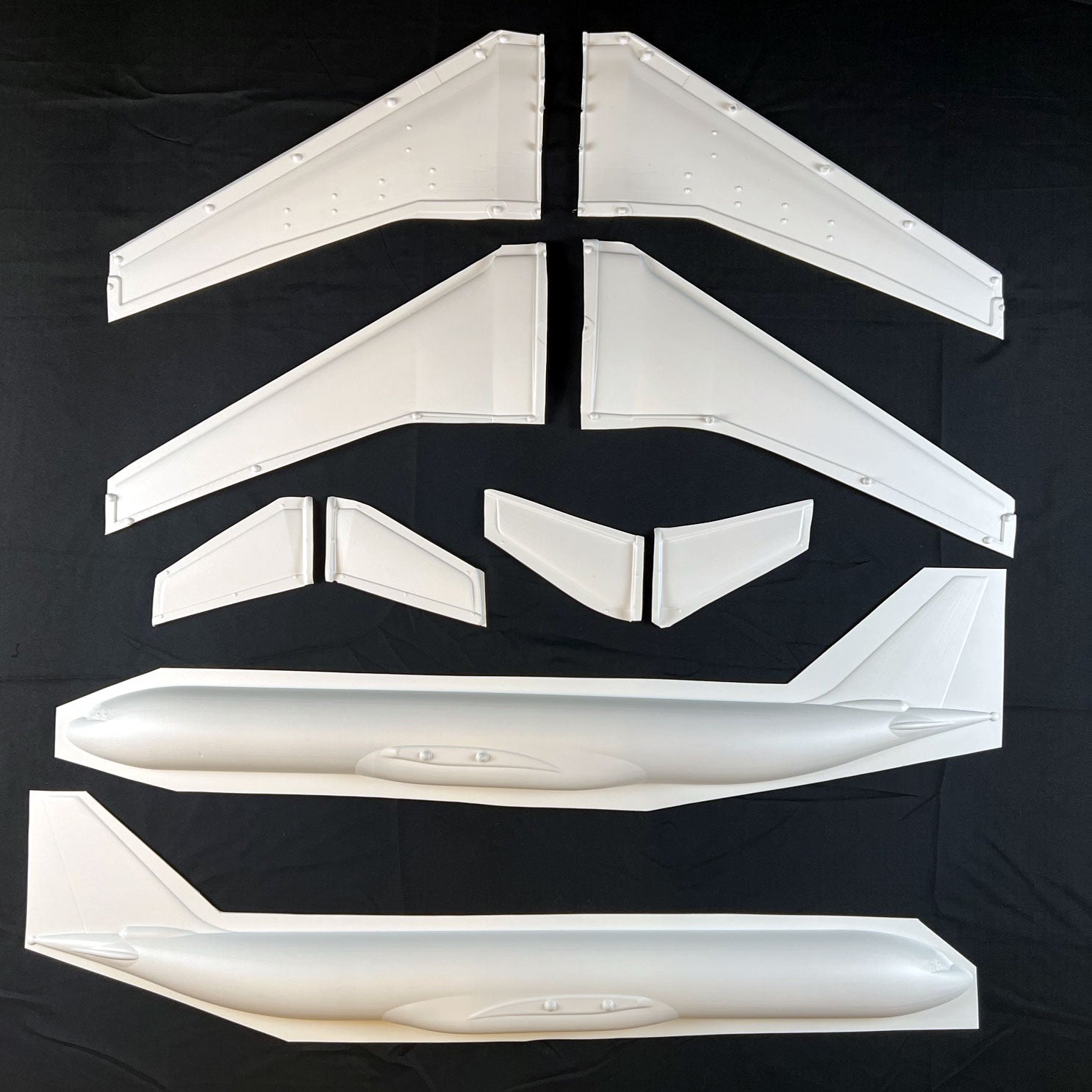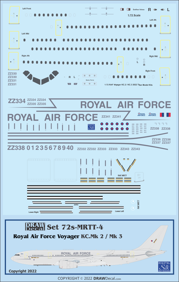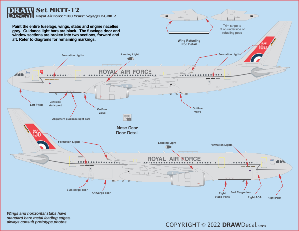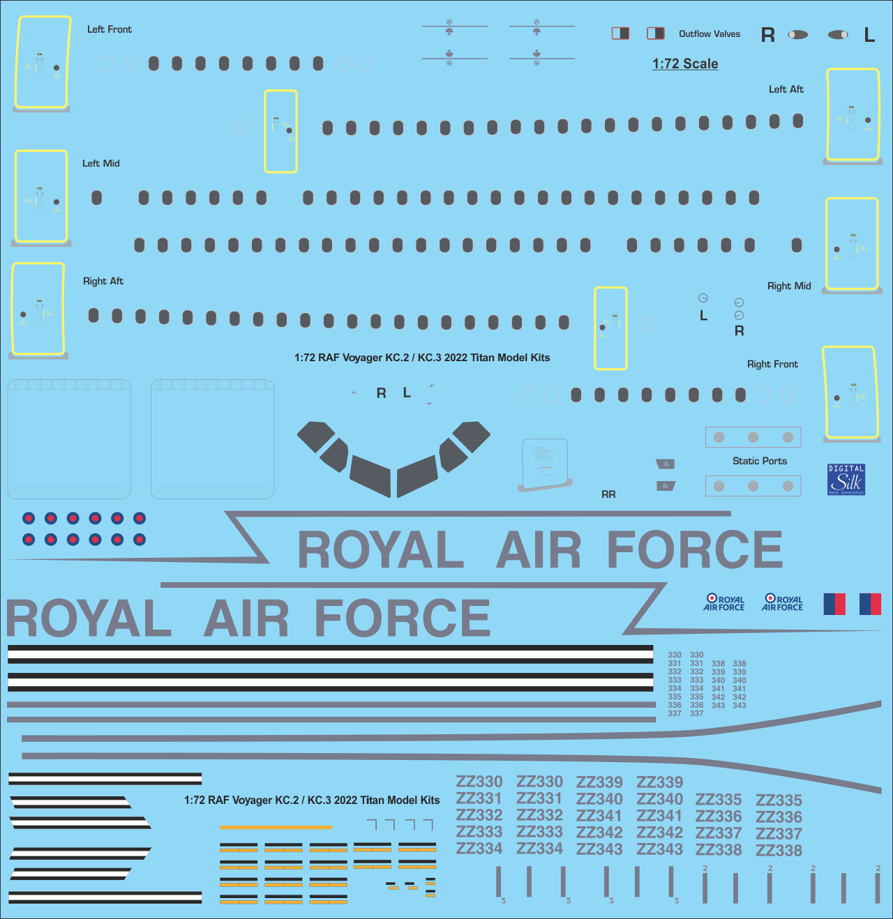 The RAF Voyager KC.2 / KC.3 kit is 31.17 inches (817mm) long, with a wingspan of 33 inches (838mm). Wings, tail, and fuselage are vacuum formed .080" high-impact polystyrene (HIPS) with recessed panel lines. Trent 772 engines, winglets, flap track fairings, all lumps & bumps, and the Cobham 905e refueling pods are made from ultra-high-resolution 3D printed resin with fine detailing. Comes with a huge decal sheet printed by DRAWDecal.com. Also includes the fuselage refueling unit (FRU) to model the KC.3 variant. Add a resin landing gear set to model the aircraft on the ground and add a cockpit set for even more detail.